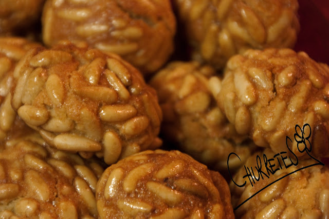 Con esta masa se hacen bolitas no muy grandes, se envuelven en piñones y finalmente se pintan con huevo batido con la ayuda de una brochita.