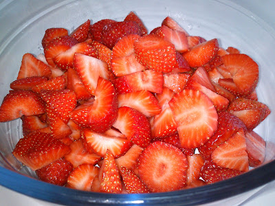 Lavamos las fresas, le cortamos los rabitos y las troceamos.